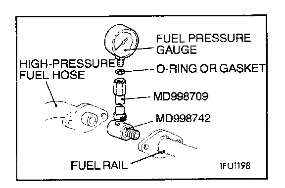 2. Place a suitable O-ring or gasket on the assembled special tools MD998709 and MD998742 and install the fuel pressure gauge.