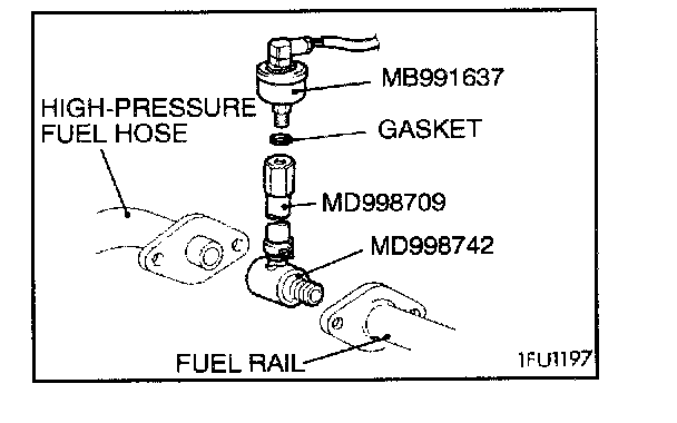 2. Install special tool MB991637 (fuel pressure gauge set) into assembled special tools MD998709 and MD998742 via a gasket.