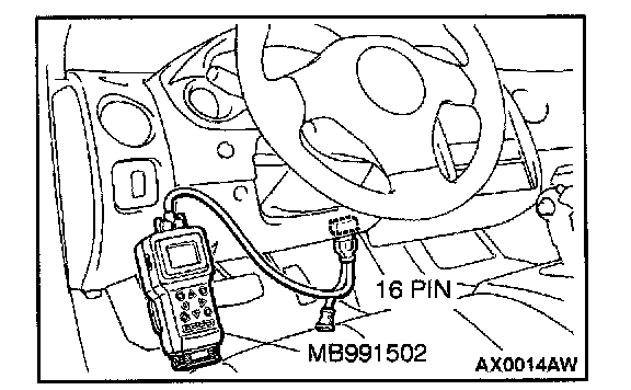 CAUTION: To prevent damage to scan tool MB991502, always turn the ignition switch to "LOCK" (OFF) position before connecting or disconnecting scan tool MB991502.