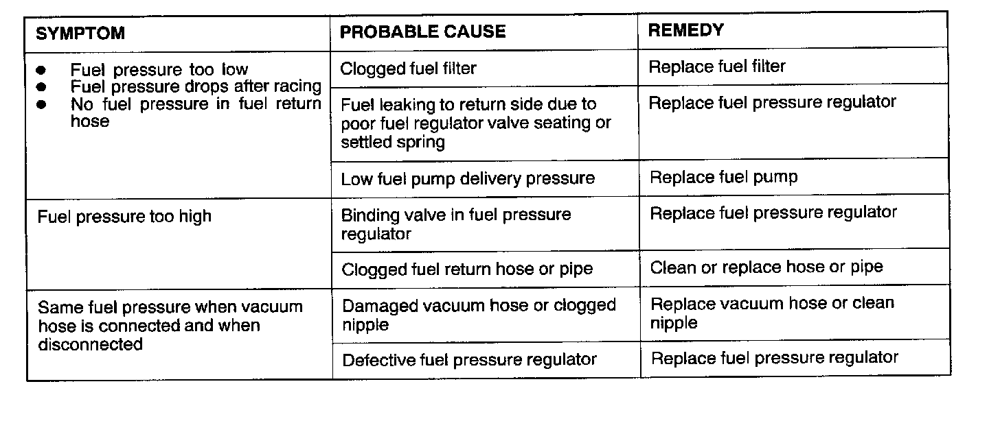 12. If any of fuel pressure measured in steps 8 to 11 is out of specification, troubleshoot and repair according to the table below.