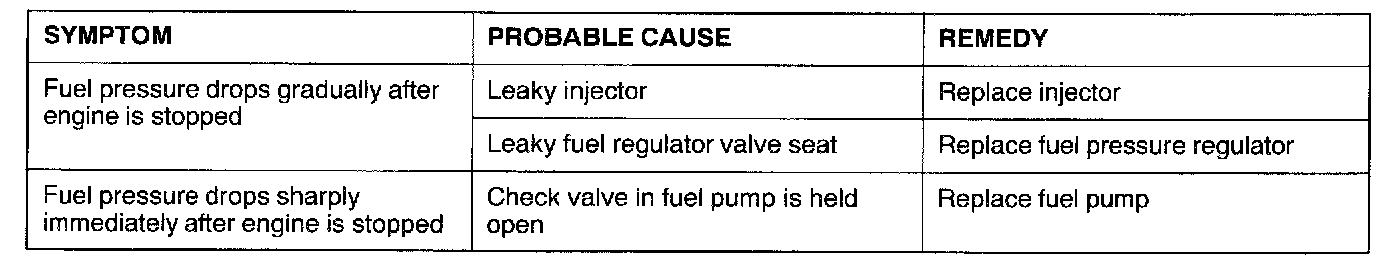 13. Stop the engine and observe fuel pressure gauge reading. It is normal if the reading does not drop within two minutes. If it does, observe the rate of drop and troubleshoot and repair according to the table below. Start, then stop the engine.
