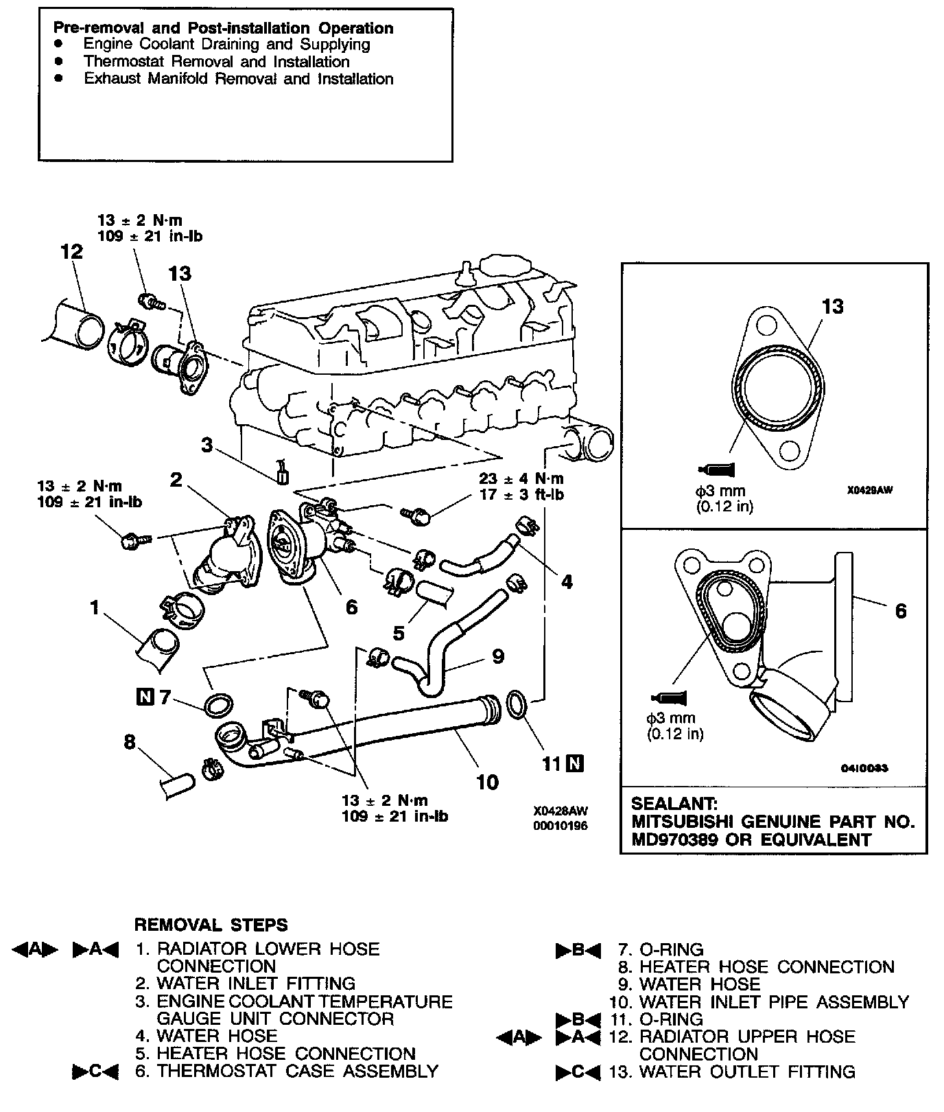 Apply a continuous bead of MITSUBISHI GENUINE Sealant Part number MD970389 or equivalent to the thermostat housing mating surface.