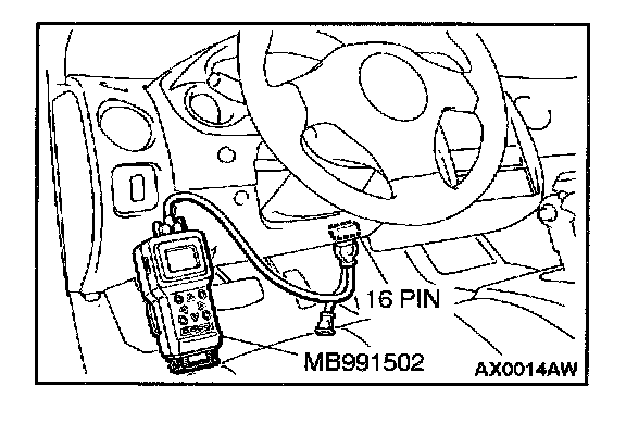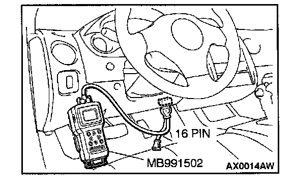 CAUTION: To prevent damage to scan tool MB991502, always turn the ignition switch to "LOCK" (OFF) position before connecting or disconnecting scan tool MB991502.
