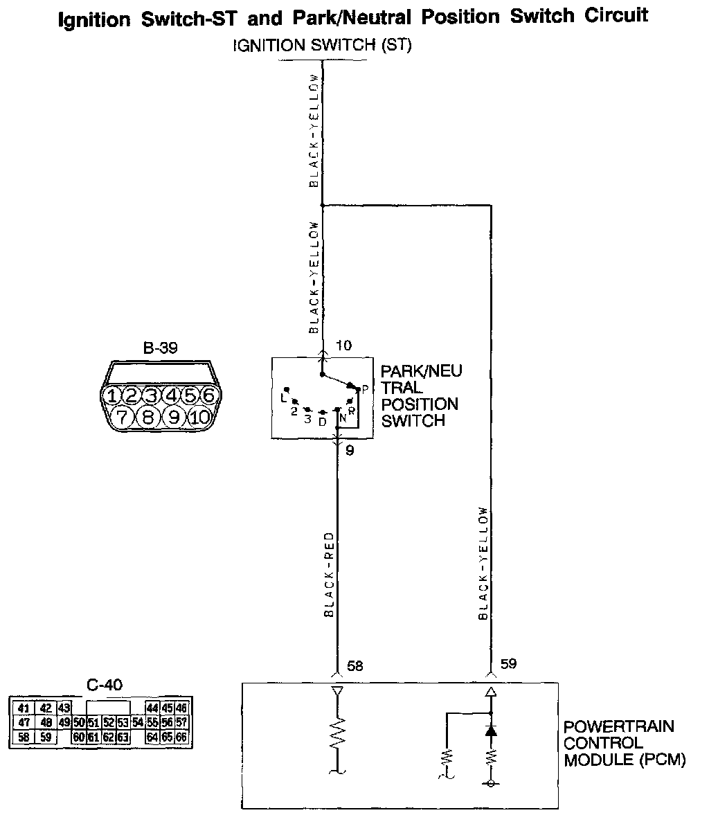 If any harness wire between park/neutral position switch connector B-39 (terminal 10) and PCM connector C-40 (terminal 59) is damaged, repair it. Then check that the malfunction is eliminated.