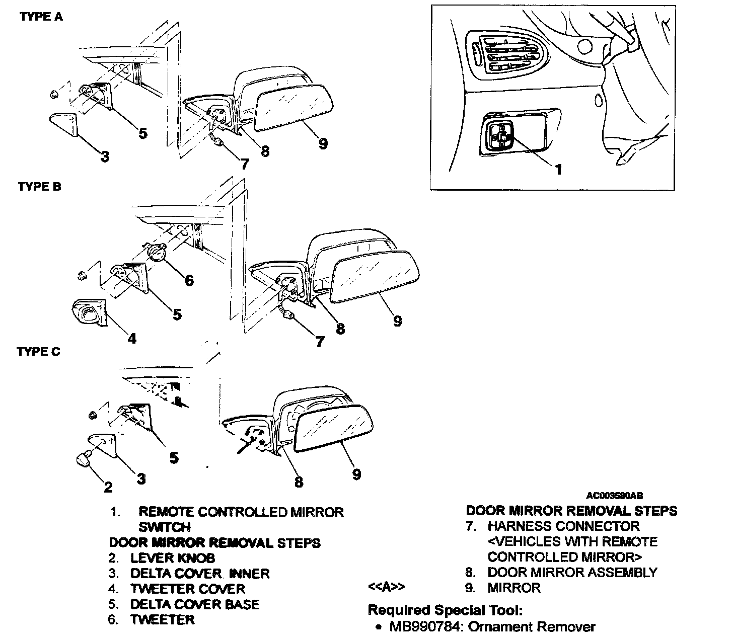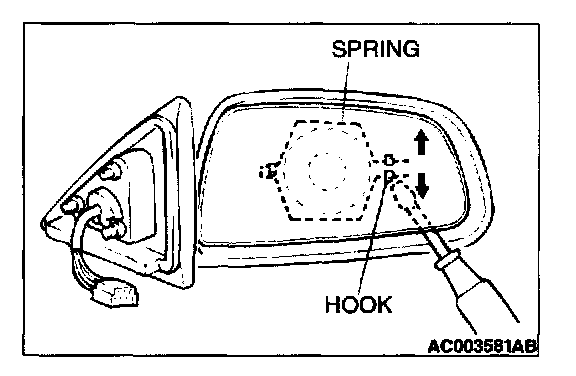 Let the mirror face up, insert a flat-tipped screwdriver wound with masking tape, and remove the mirror by releasing the spring from the hook.