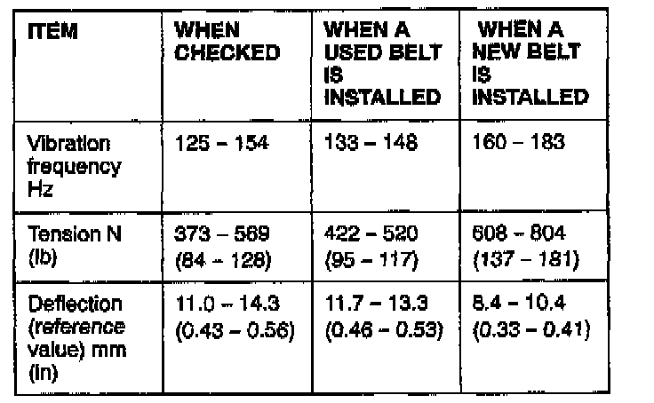 Apply 98 N (22 lbs.) of force to the middle of the drive belt between the pulleys (at the place indicated by the arrow) and check that the amount of deflection is within the standard value range.