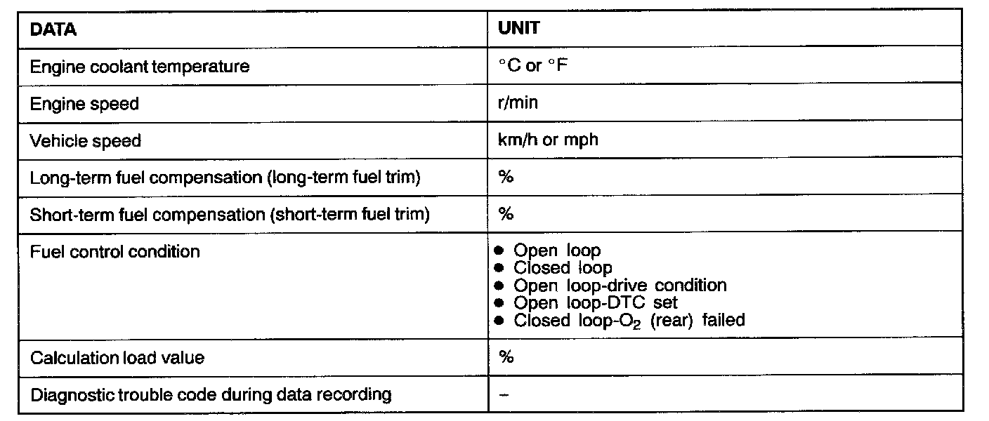 This data can be read by using the scan tool, and can then be used in simulation tests for troubleshooting. Data items are as shown.