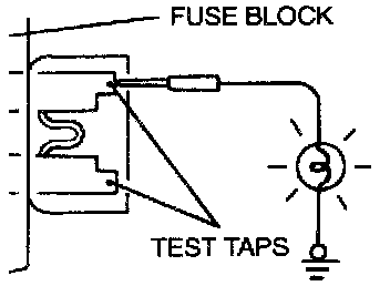 A blade type fuse has test taps provided to allow checking of the fuse itself without removing it from the fuse block. The fuse is okay if the test light comes on when its one lead is connected to the test taps (one at a time) and the other lead is grounded.