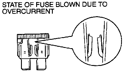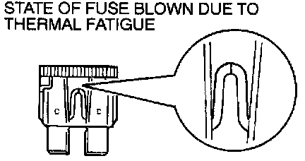 The illustration shows the state of a fuse blown due to this cause. In this case, do not replace the fuse with a new one hastily since a current heavy enough to blow the fuse has flowed through it. First, check the circuit for shorts and check for abnormal electric parts. After correcting shorts or replacing parts, use only a fuse of the same capacity as a replacement. Never use a fuse of larger capacity than the original fuse. If a larger capacity fuse is used, electric parts or wirings could be damaged.