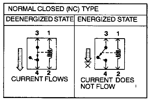 When a normal closed relay as illustrated here is checked, there should be continuity between terminals 1 and 2 and between terminals 3 and 4 when the relay is deenergized. There should be no continuity between terminals 3 and 4 when the battery voltage and ground are applied to terminals 1 and 2.