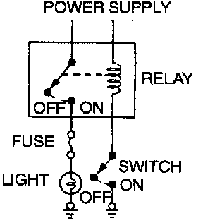 2. By using a relay, a heavy current can be turned on and off by a switch using much less current. For example, in the circuit shown here, when the switch is turned on (closed), current flows to the coil of the relay. Then, its contact is turned on (closed) and the light comes on. The current flowing through the switch is much less than that for the light.