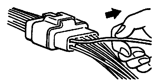 If the connector pin stopper is damaged, the terminal connections (male and female pins) will not be perfect even when the connector body is connected, because the pins may pull out of the back side of the connector. Therefore, gently pull the wires one by one to make sure that no pins pull out of the connector.