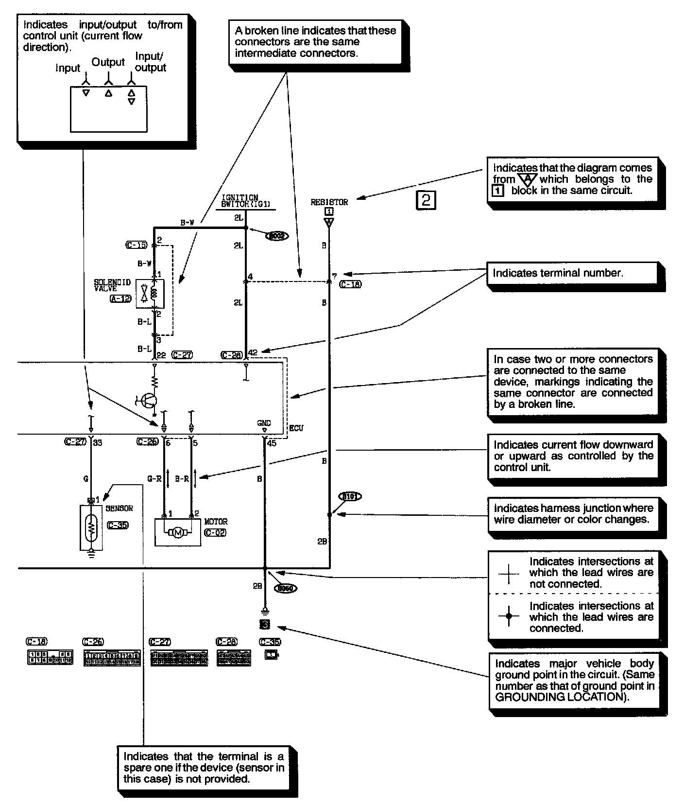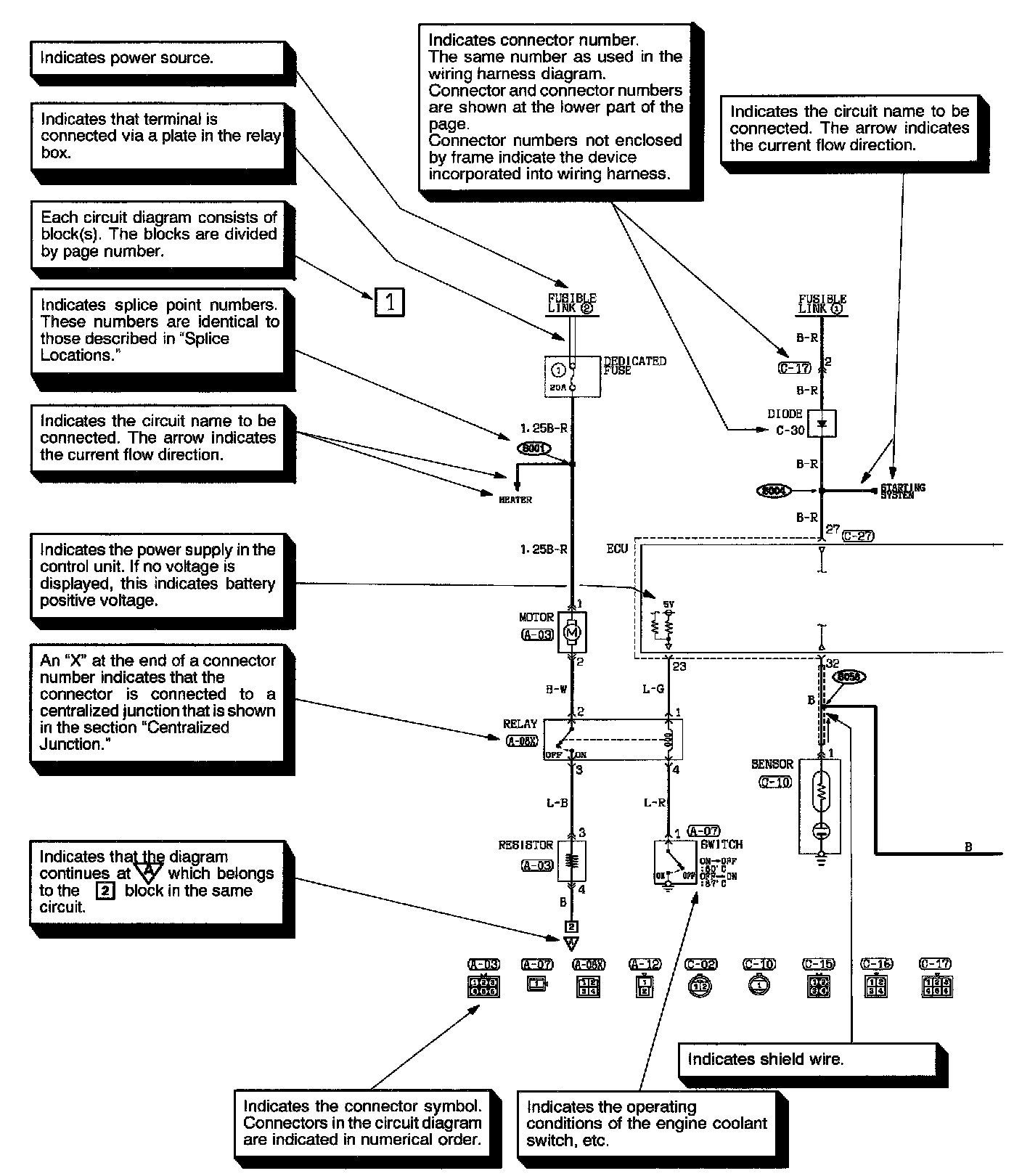 The circuit of each system from the fuse (or fusible link) to ground is shown. The power supply is shown at the top and the ground at the bottom to facilitate understanding of how the current flows.