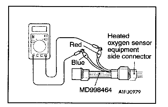 2. Make sure that there is continuity [4.5 - 8.0 Ohms at 20 °C (68 °F)] between terminal 1 (red clip of special tool) and terminal 3 (blue clip of special tool) on the heated oxygen sensor connector.