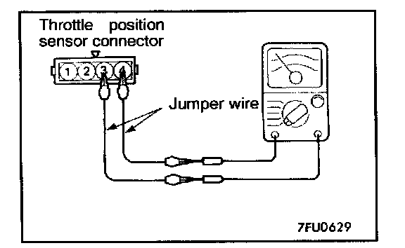 2. Connect an ohmmeter between terminal 3 (closed throttle position switch) and 4 (sensor ground) by using jumper wires.