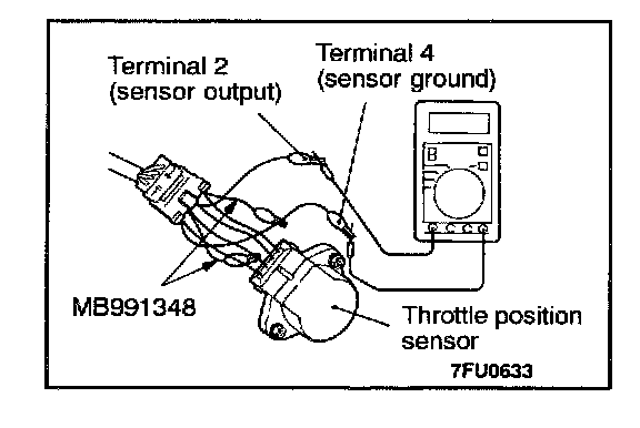 2. Connect a digital voltmeter between the throttle position sensor terminal 2 (sensor output) and terminal 4 (sensor ground.)