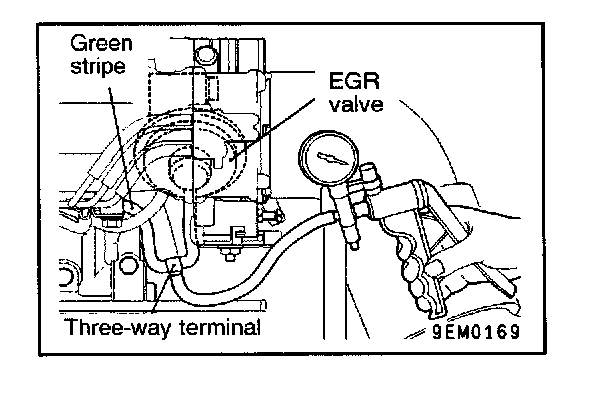 EGR SYSTEM CHECK1. Disconnect the vacuum hose (green stripe) from the EGR valve, and then connect a hand vacuum pump via the three-way terminal