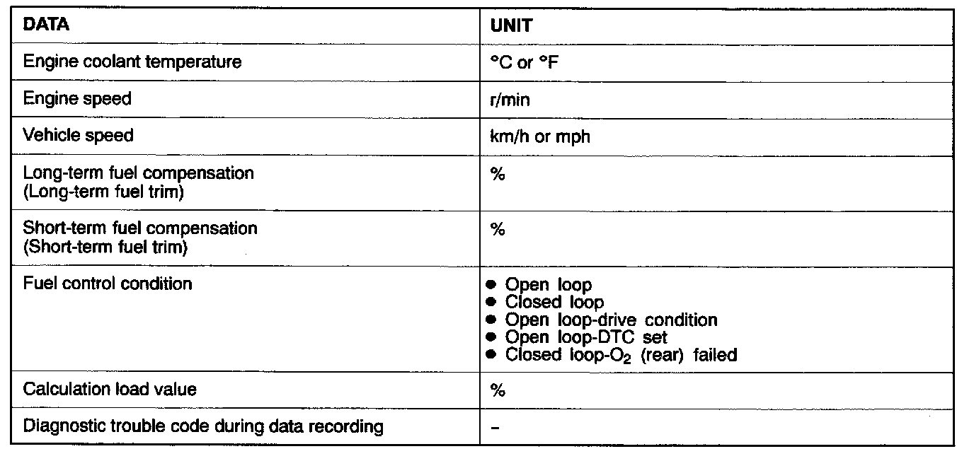 This data can be read by using the scan tool, and can then be used in simulation tests for troubleshooting. Data items are as follows.