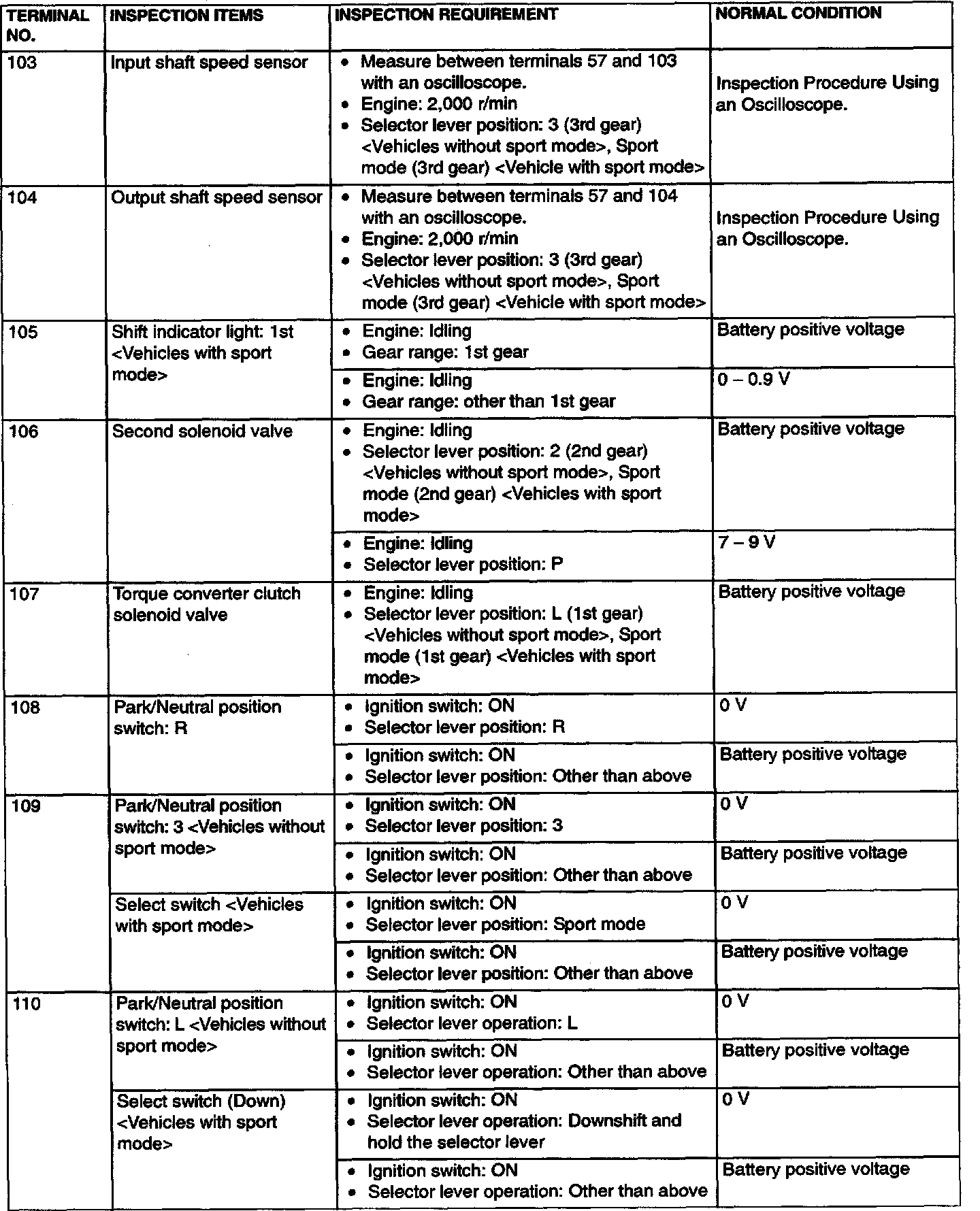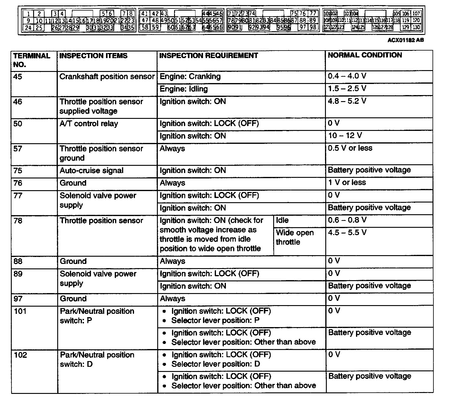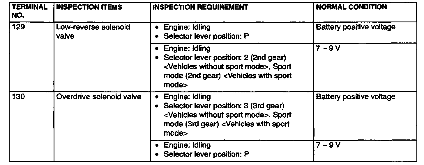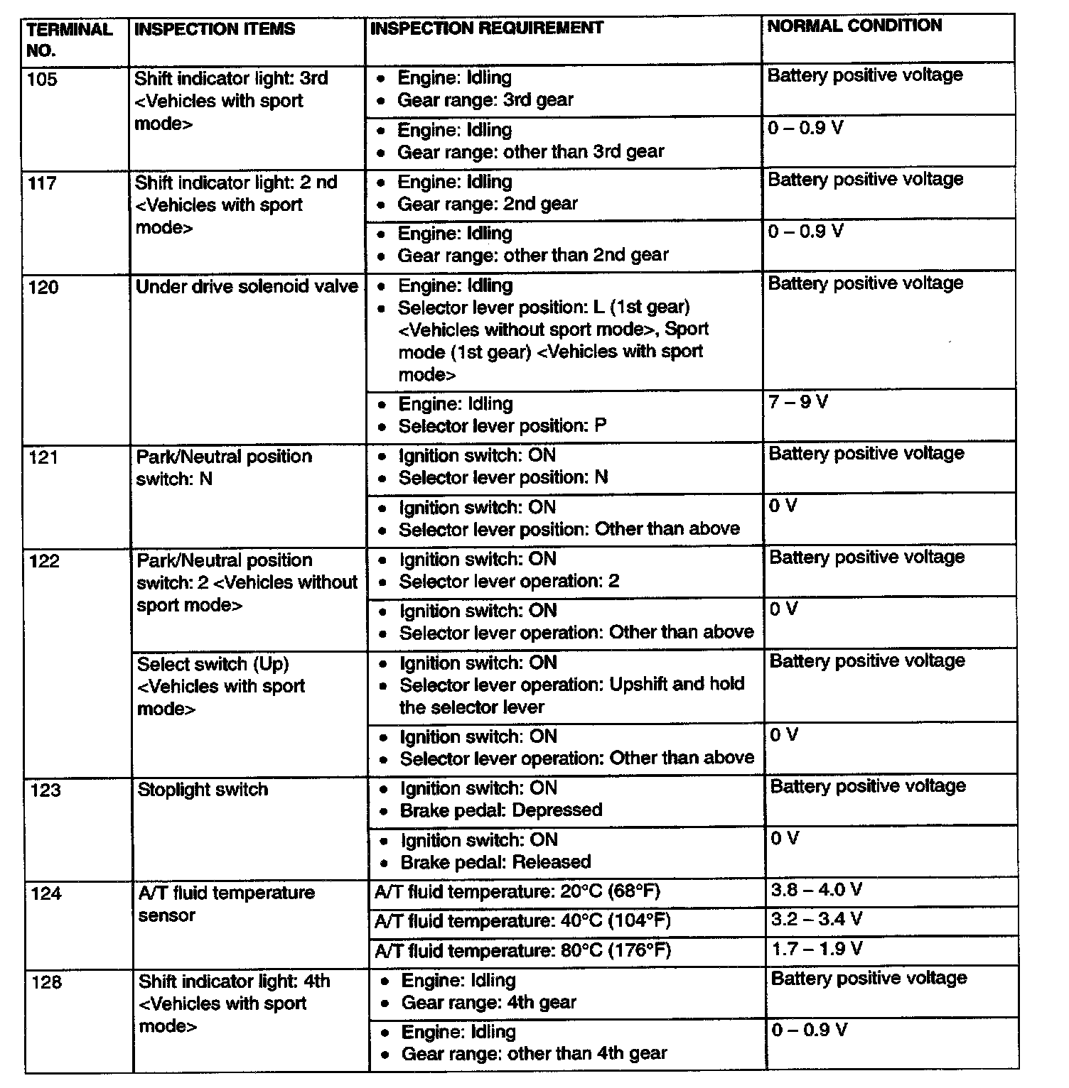 PCM TERMINAL VOLTAGE REFERENCE CHART FOR TRANSAXLE OPERATION