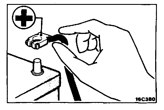 When the body is used as the ground during welding for body repairs, be absolutely sure to first disconnect the battery's positive (+) cable.