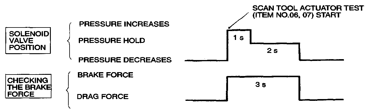 6. Turn the wheel by hand and check the change in braking force. Use a braking force tester. The braking force reading value should change when the actuator test is carried out. The result should be as shown in the diagram.