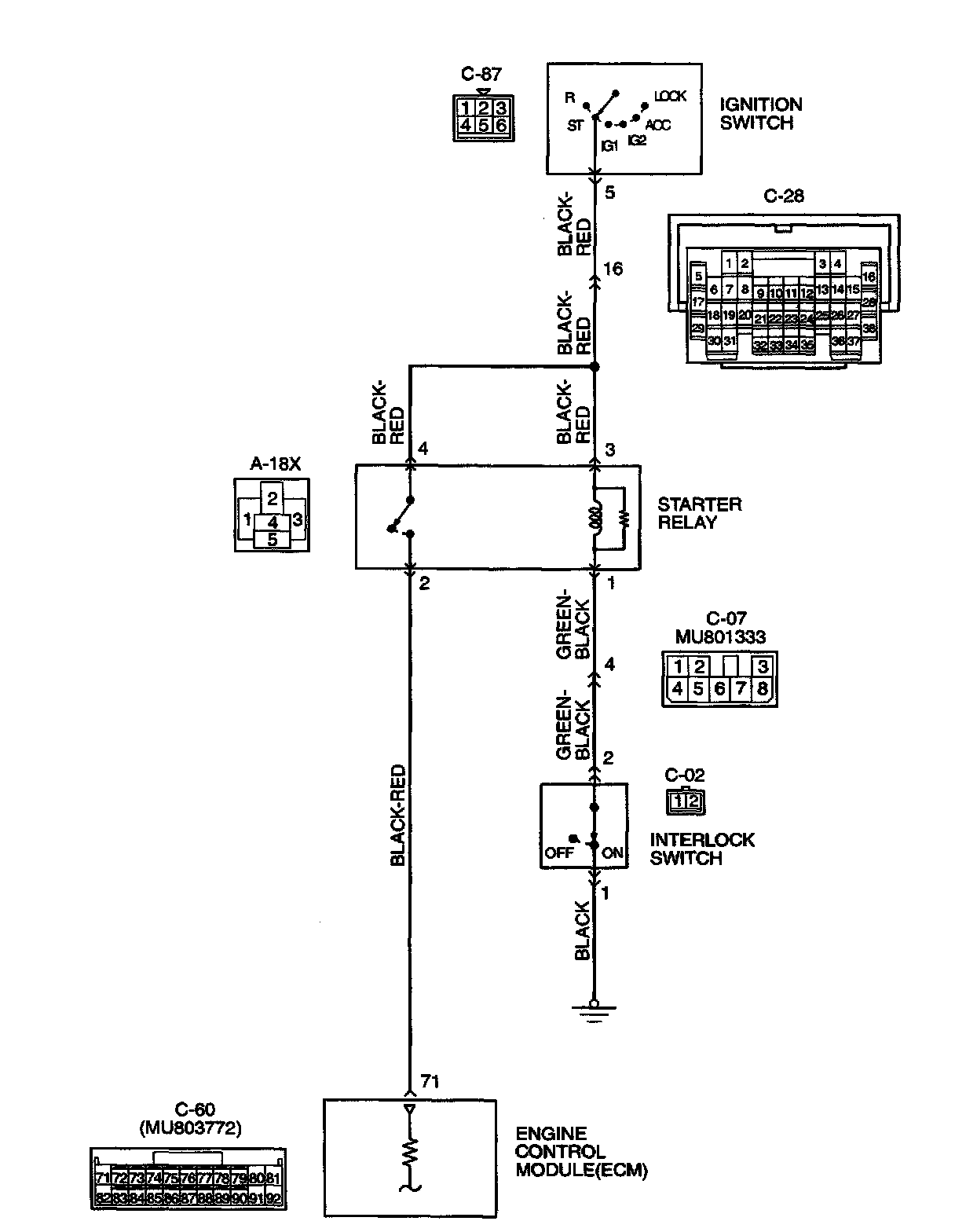 - The battery positive voltage is supplied to the ECM (terminal 71) via the starter relay during engine cranking. With this, the ECM detects that the engine is being cranked.