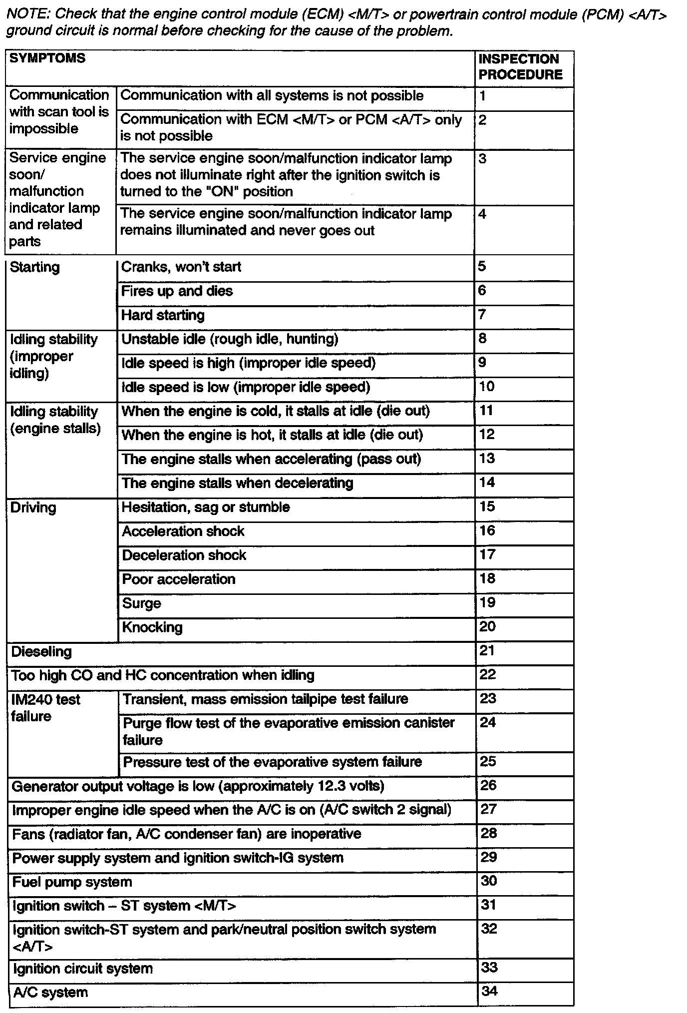 Inspection Chart For Trouble Symptoms: