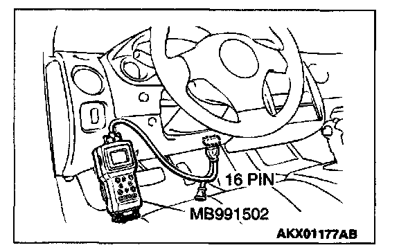 CAUTION: To prevent damage to scan tool MB991502, always turn the ignition switch to the "LOCK" (OFF) position before connecting or disconnecting scan tool MB991502.