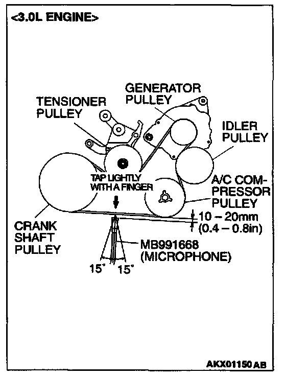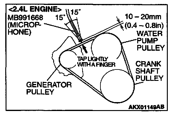 4. Hold special tool MB991668 (microphone) to the middle of the drive belt between the pulleys (at the place indicated by the arrow), about 10 - 20 mm (0.4 - 0.8 inch) away from the rear surface of the belt and so that it is perpendicular to the belt (within an angle of ± 15 degree angle).