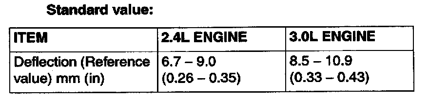 Apply 98 N (22 pound) of force to the middle of the drive belt between the pulleys (at the place indicated by the arrow) and check that the amount of deflection in within the standard value.