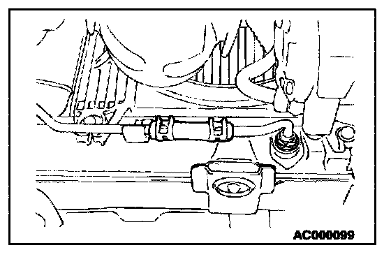 1. Disconnect the hose shown in the illustration which connects the transaxle and the oil cooler (inside the radiator). Place a container under the hose to collect the discharge.