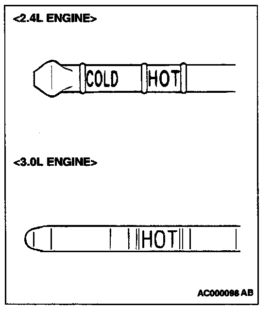 NOTE: The A/T fluid temperature is measured with scan tool (MUT-II). The "COLD" level is for reference only; the "HOT" level should be regarded as the standard level.