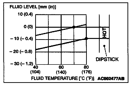 NOTE: If it takes some amount of time until the A/T fluid reaches its normal operating temperature [70 - 80 °C (158 - 176 °F)], check the A/T fluid level by referring to the diagram.