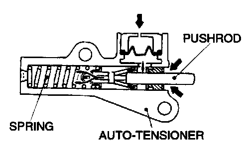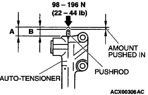 1. While holding the auto-tensioner with your hand, press the end of the pushrod against a metal surface (such as the cylinder block) with a force of 98 - 196 N (22 - 44 pound) and measure how far the pushrod is pushed in.