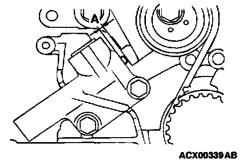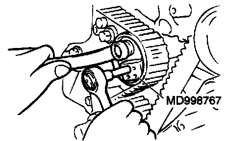 4. Use special tool MD998767 to push the tensioner pulley into the timing belt, then temporarily tighten the center bolt.