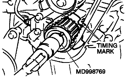 5. Use special tool MD998769 to turn the crankshaft 1/4 turn counterclockwise, then turn it again clockwise until the timing marks are aligned.