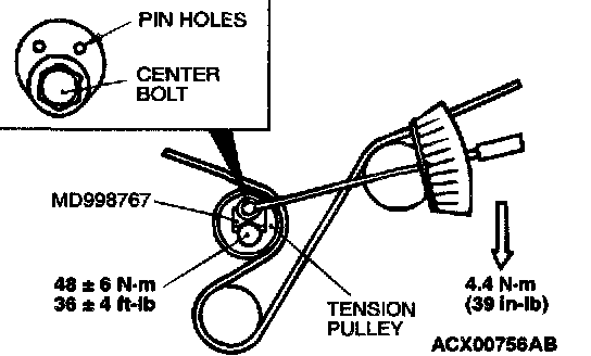 6. Loosen the center bolt of the tensioner pulley. Use special tool MD998767 and a torque wrench to apply the tension torque to the timing belt. Then tighten the center bolt to the specified torque.