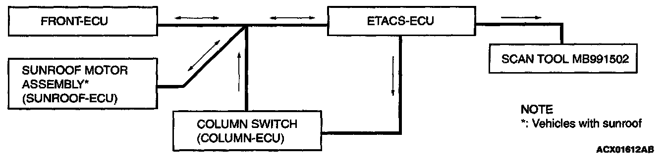 As shown below, signal wires used exclusively for transmitting multiplex signal data connect the ETACS-ECU, front-ECU, column switch (incorporating the column-ECU) and sunroof motor assembly (incorporating the sunroof-ECU) and these components communicate with each other.