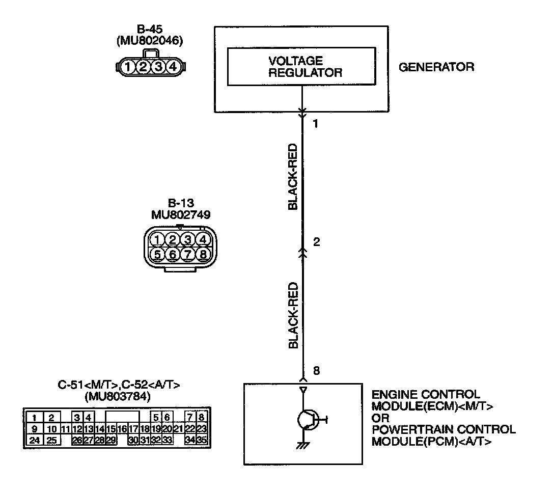 STEP 5. Check for open circuit and short circuit to ground and harness damage between generator connector B-45 terminal 1 and ECM connector C-51 terminal 8