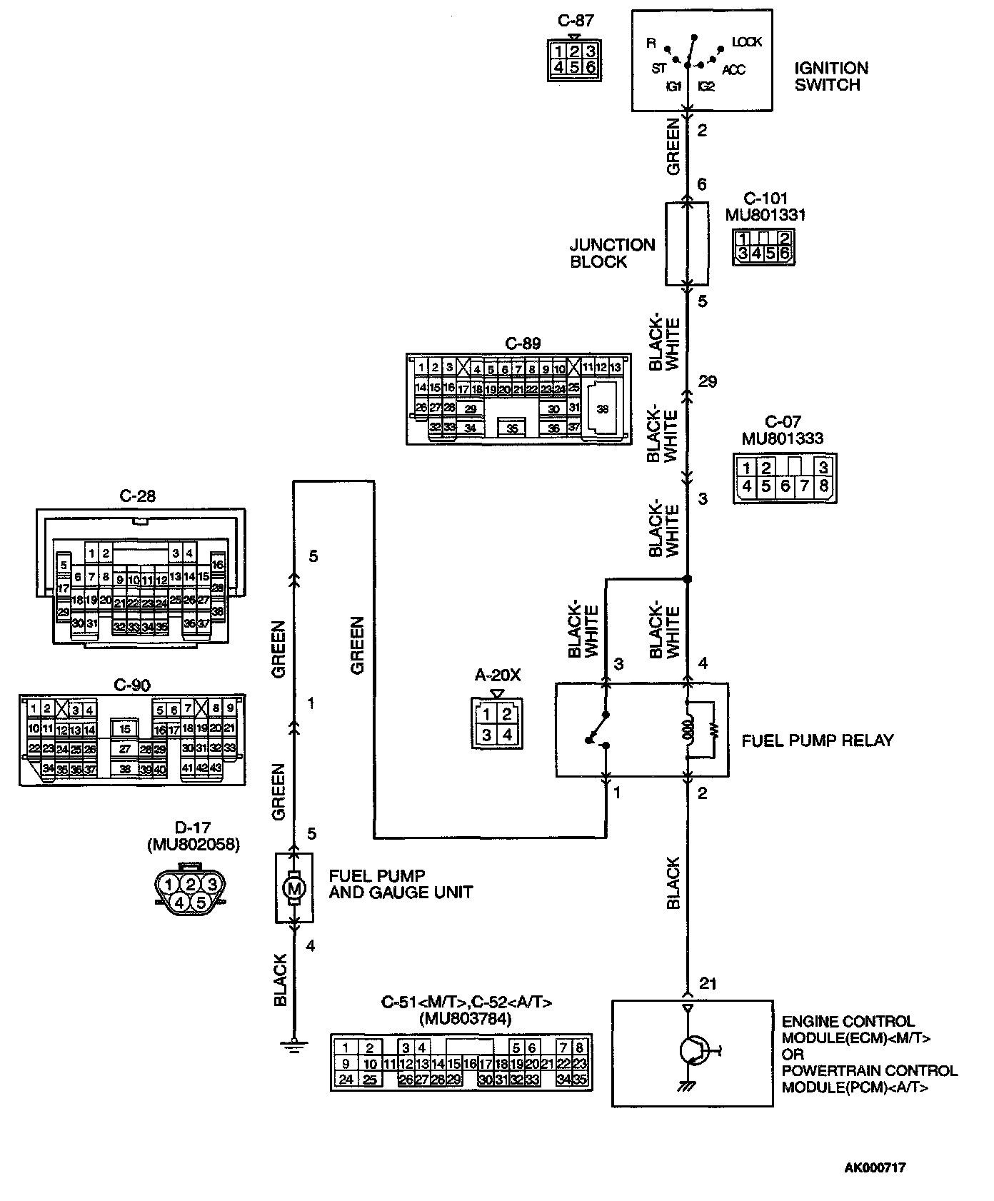 STEP 8. Check for open circuit and short circuit to ground and harness damage between fuel pump relay connector A-20X terminal 1 and fuel pump connector D-17 terminal 5.