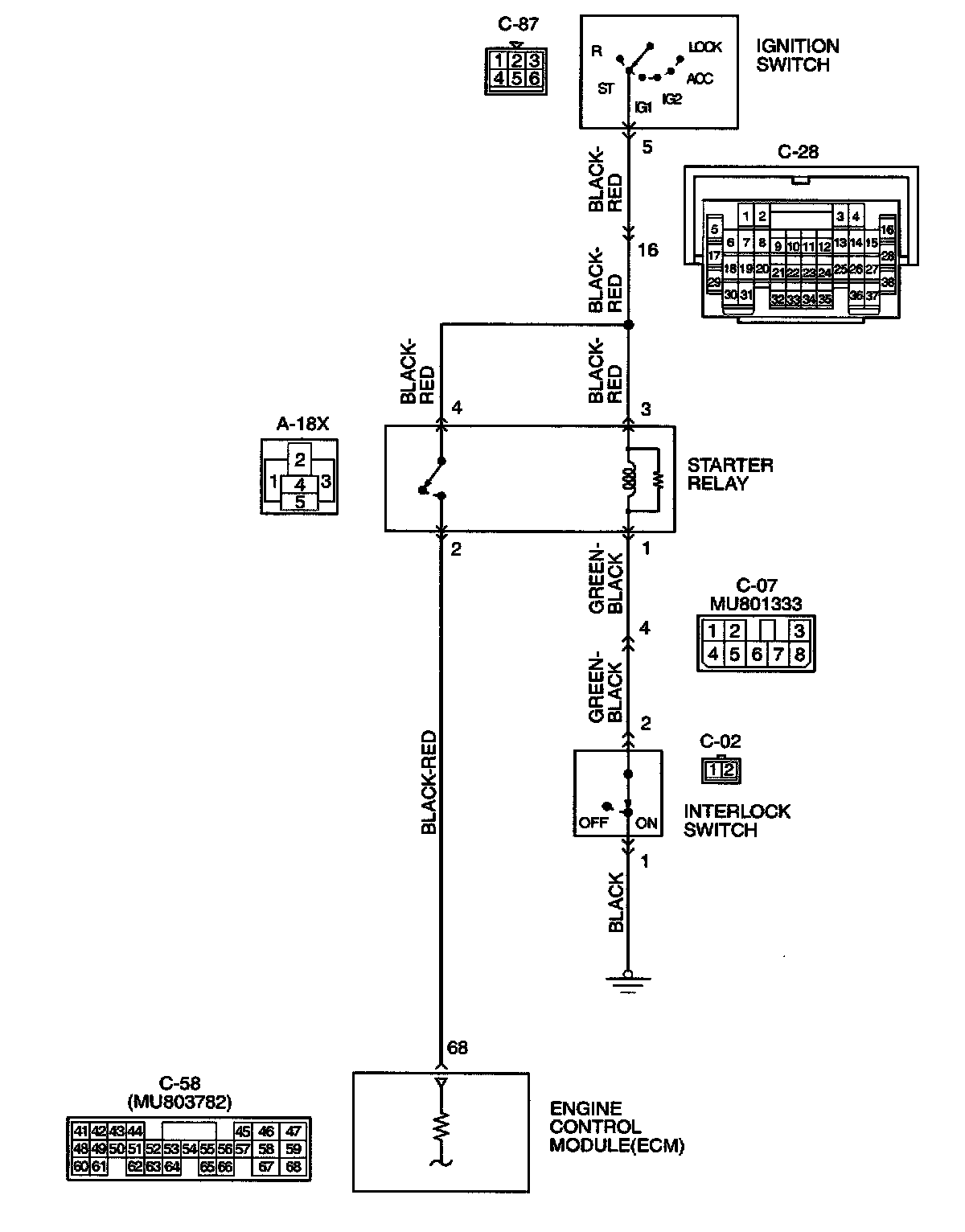 - The battery positive voltage is supplied to the ECM (terminal 68) via the starter relay during engine cranking. With this, the ECM detects that the engine is being cranked.