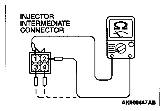 2. Measure the resistance between each injector side connector terminals 1 and 2.
