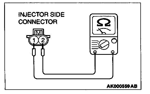 3. Measure the resistance between injector side connector terminals 1 and 2.