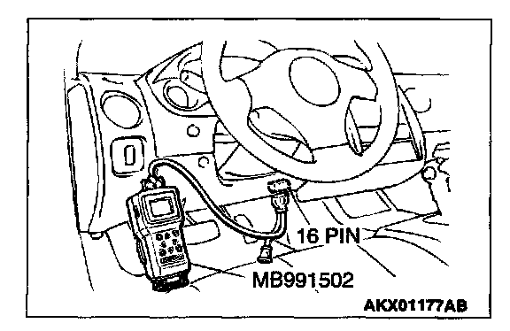 CAUTION: To prevent damage to scan tool MB991502, always turn the ignition switch to the "LOCK" (OFF) position before connecting or disconnecting scan tool MB991502.