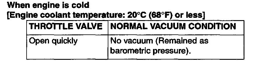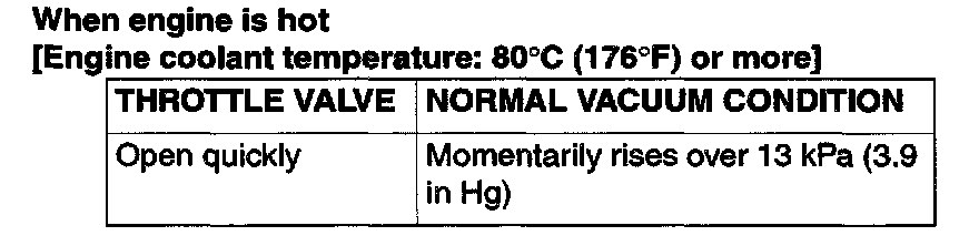 2. Start the engine. Check the vacuum condition when the throttle valve is opened suddenly (revving) during cold and hot engine conditions. If the engine is hot and the vacuum does not rise over 13 kPa (3.9 in Hg), perform the vacuum control valve check and EGR port vacuum check. Then continue to Step 3. If vacuum rises momentarily, proceed to Step 3.
