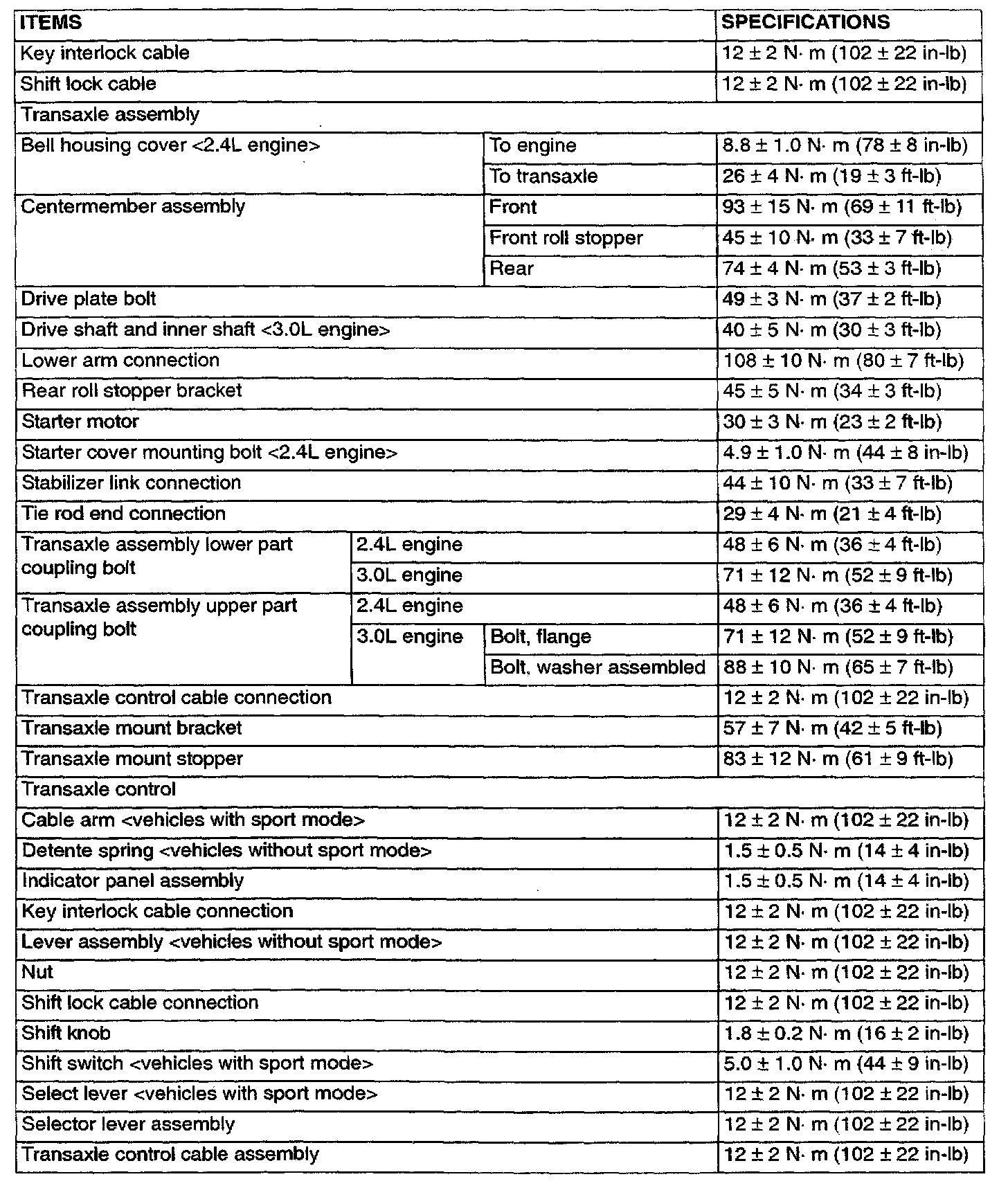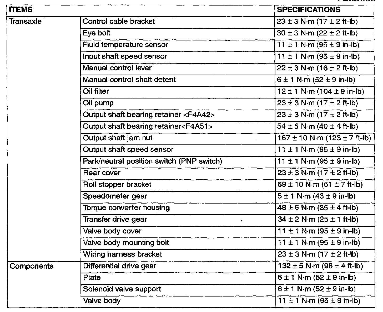 F4A42/F4A51 4-spd A/T, Transaxle Torque: