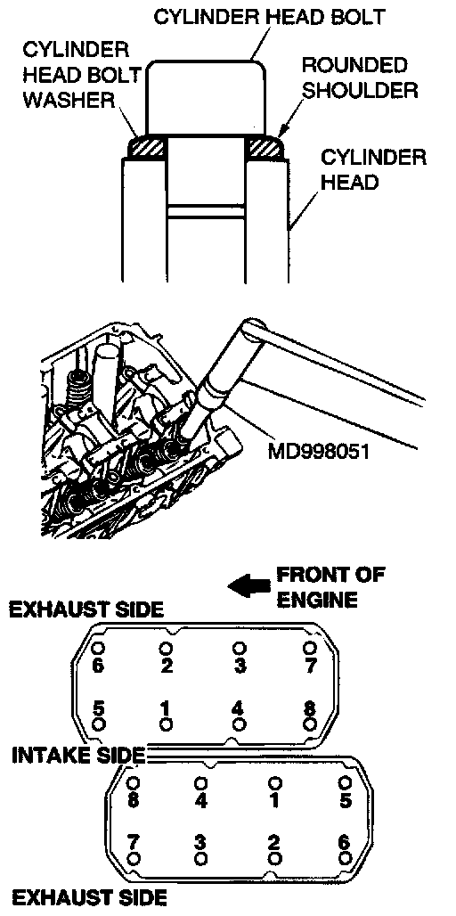 Using special tool MD998051 and a torque wrench, tighten the bolts to the specified torque in the order. (in two or three steps)