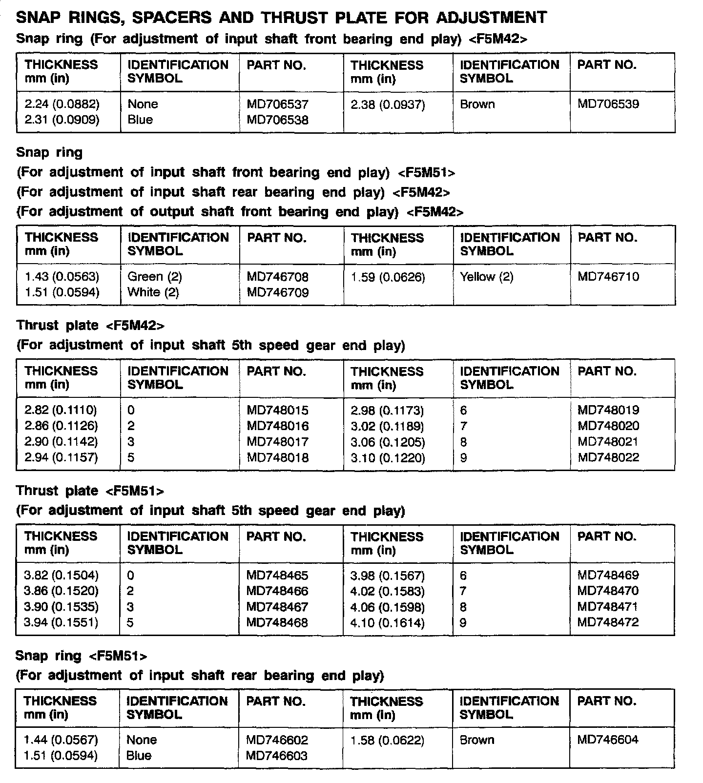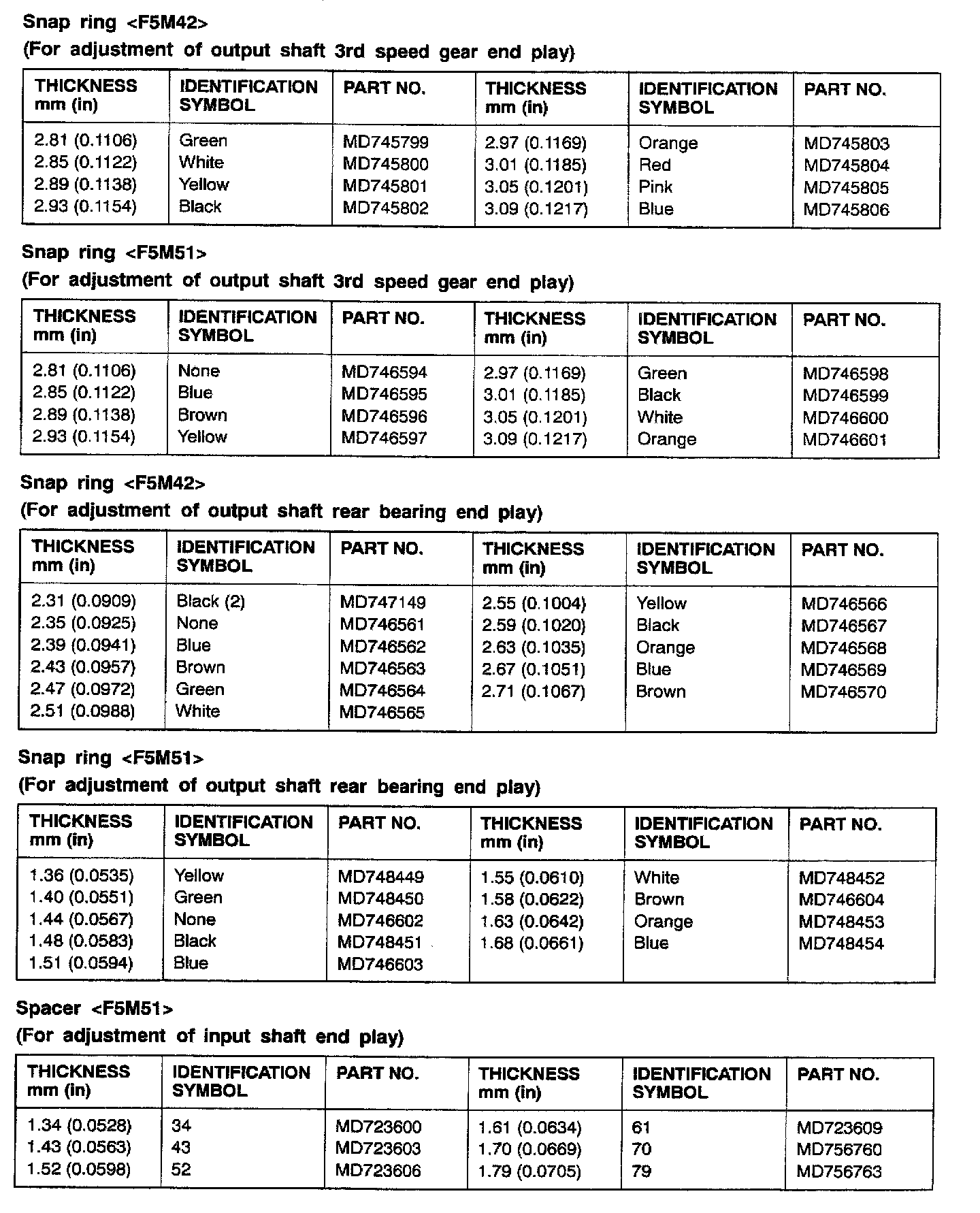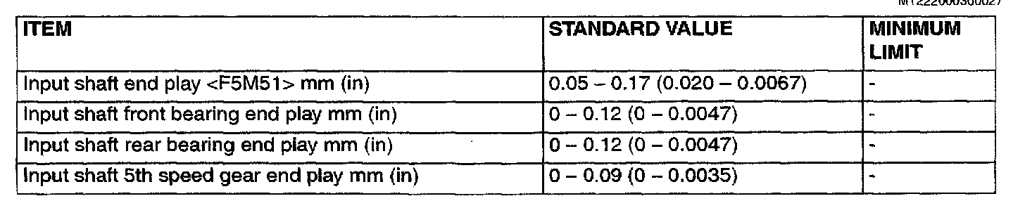 F5M42/F5M51 5-spd M/T, Input Shaft & Output Shaft Bearing End Play: