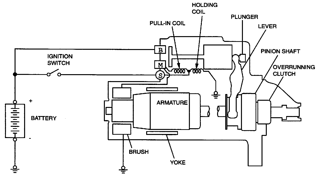 GENERAL DESCRIPTIONIf the ignition switch is turned to the "START" position, current flows in the coil provided inside magnetic switch, attracting the plunger. When the plunger is attracted, the lever connected to the plunger is actuated to engage the starter clutch. On the other hand, attracting the plunger will turn on the magnetic switch, allowing the B terminal and M terminal to conduct. Thus, current flows to engage the starter motor.