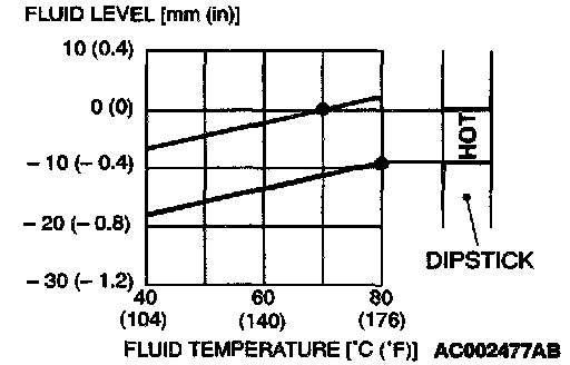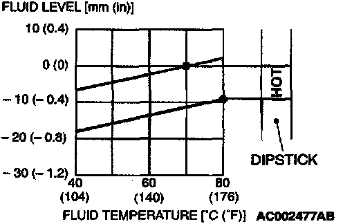 12. Drive the vehicle until the A/T fluid temperature rises to the normal temperature [70 - 80°C (158 - 176°F)], and then check the A/T fluid level again. The A/T fluid level must be at the "HOT" mark.
